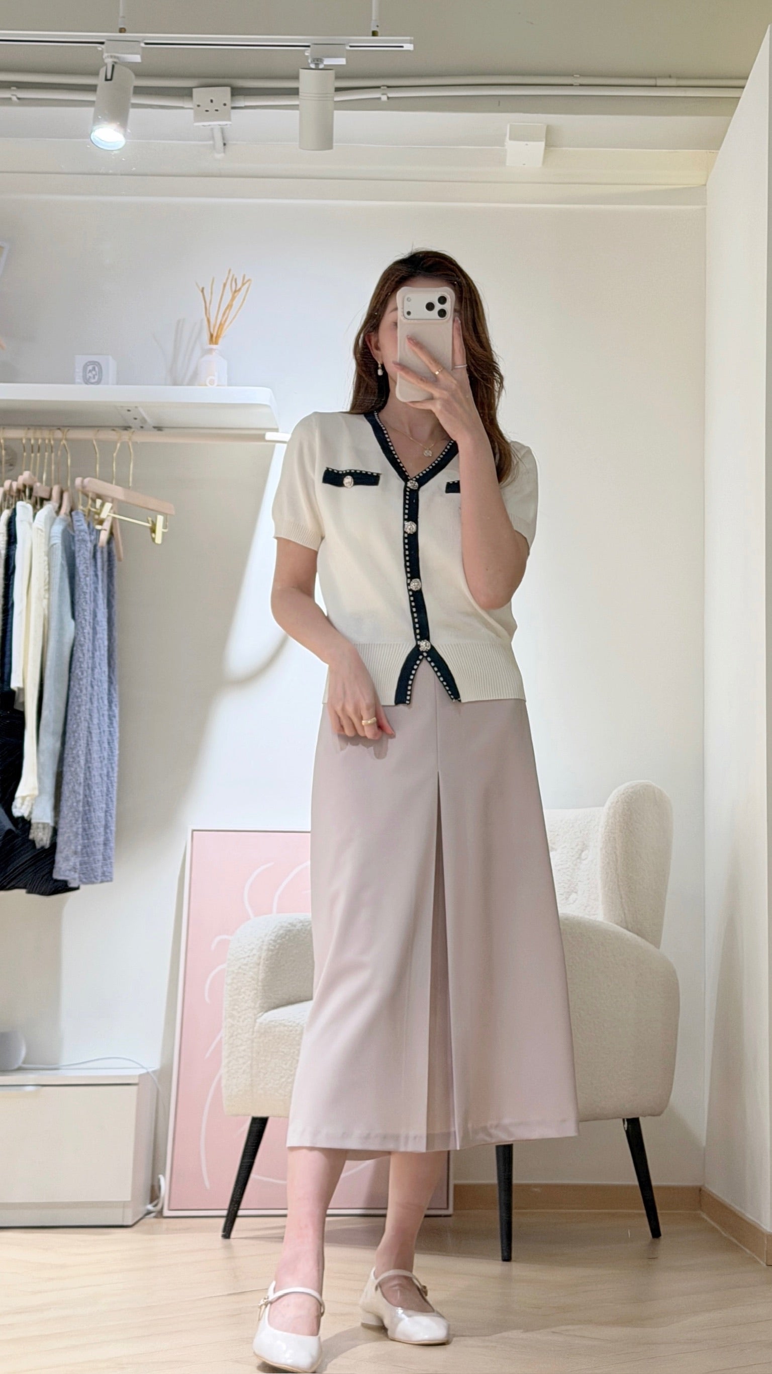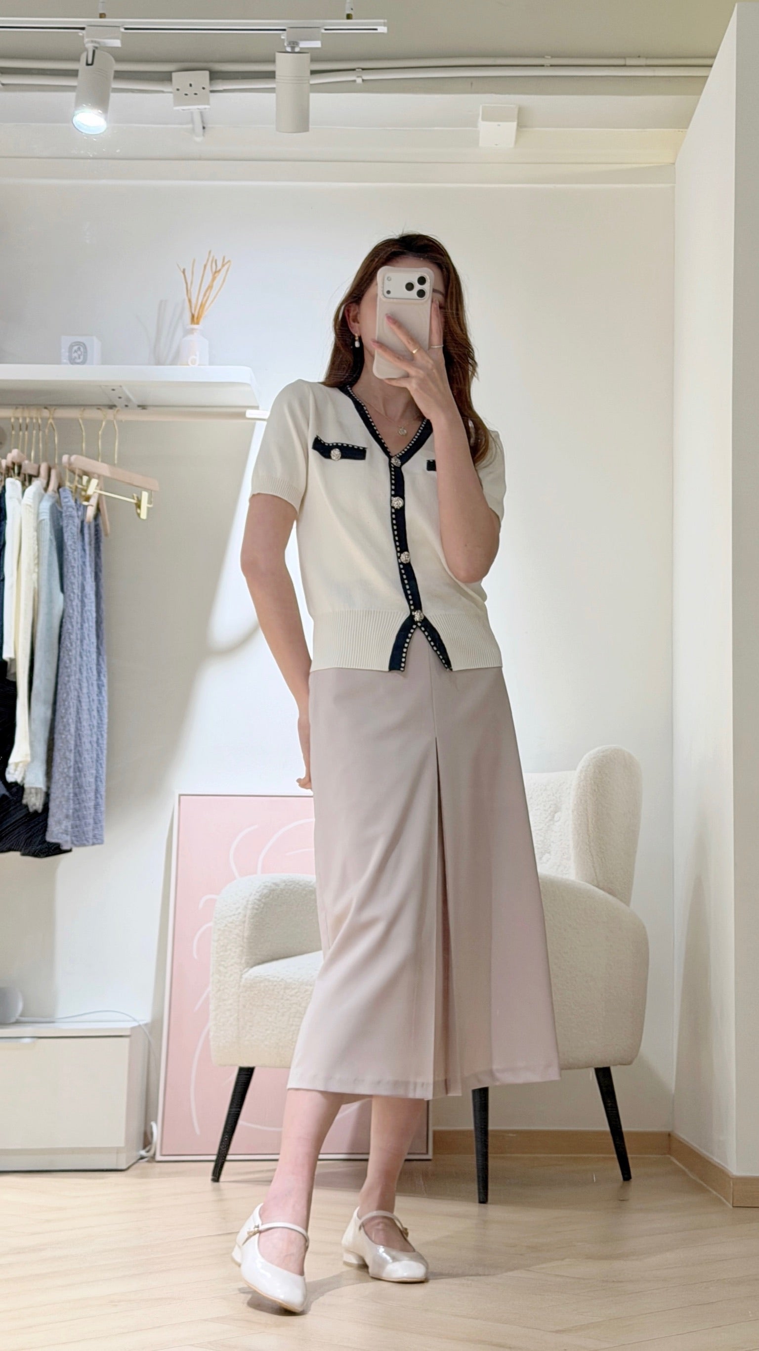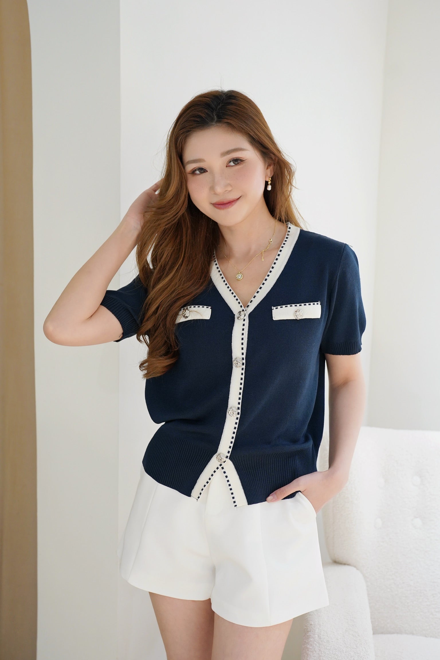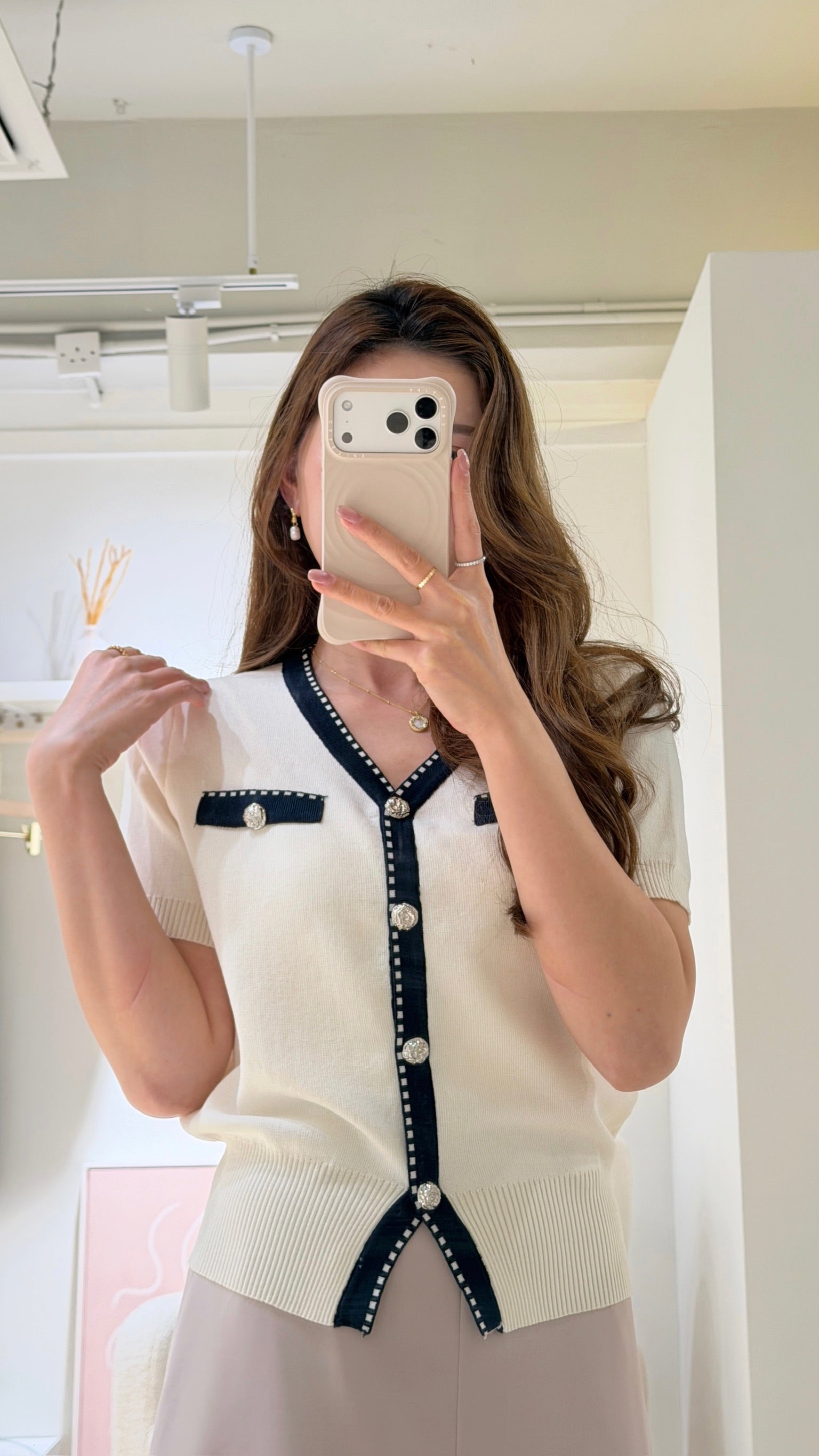 優雅 V 領上衣|銀色鈕扣 × 立體拼邊✨細節滿分