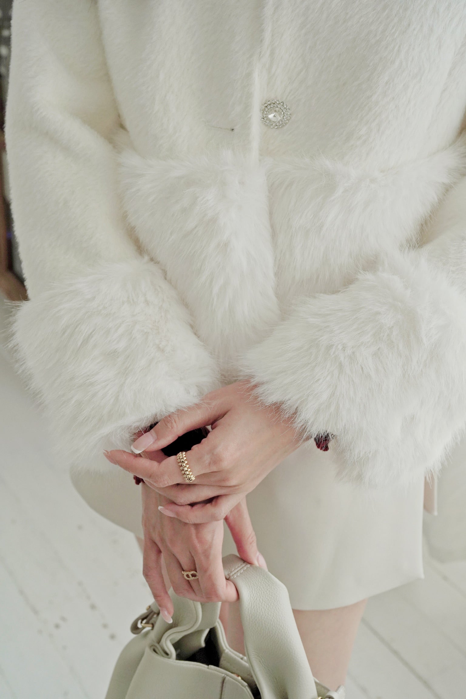 雪白色温柔 下擺及袖口的毛毛光滑高級