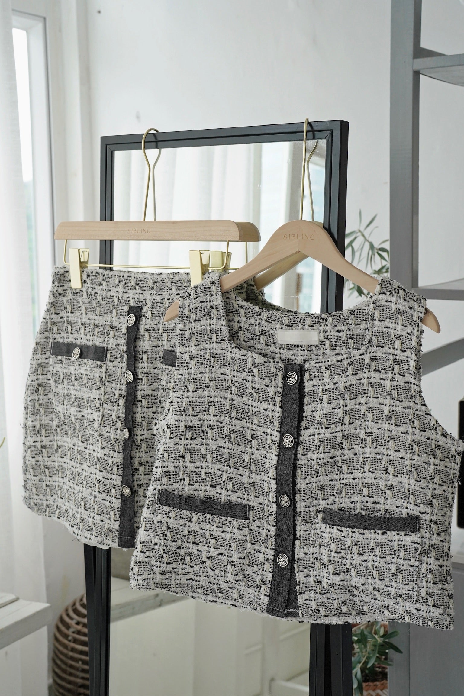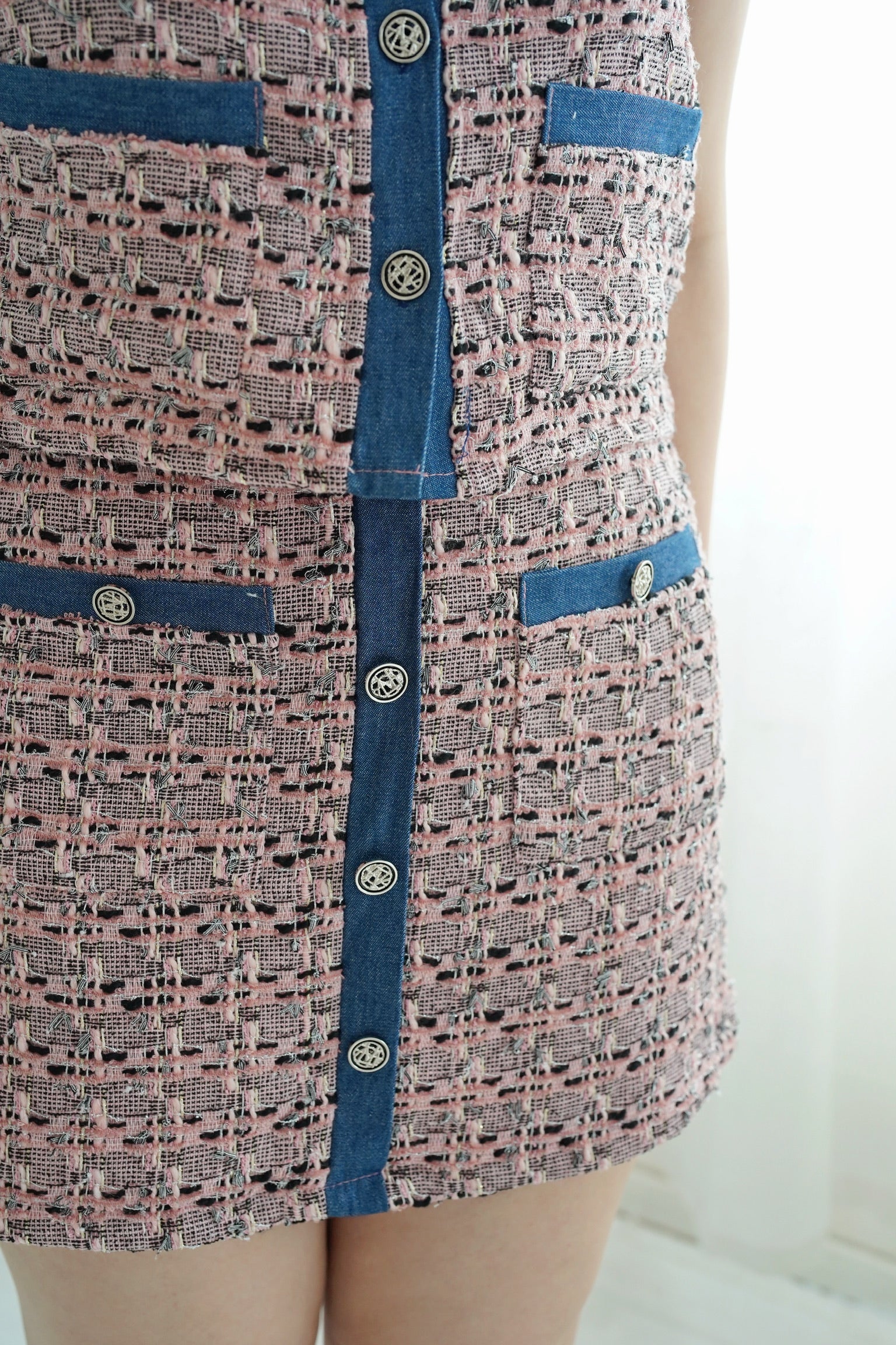 配上質感鈕扣 不同顏色拼湊而成的混線布料
